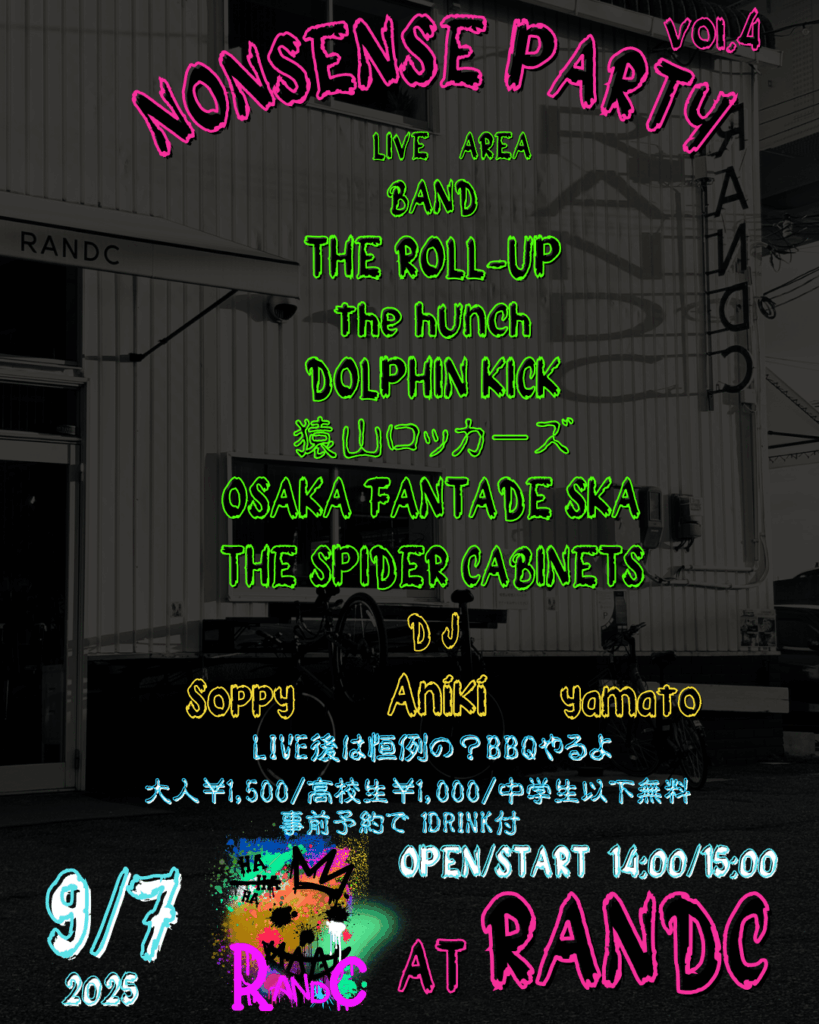 2025.9.7 (sun) OPEN 14:00/START 15:00at 箕面 RANDC大人¥1,500 / 高校生¥1,000 / 中学生以下無料※事前予約で1DRINK付THE ROLL UPthe hunch猿山ロッカーズOS...